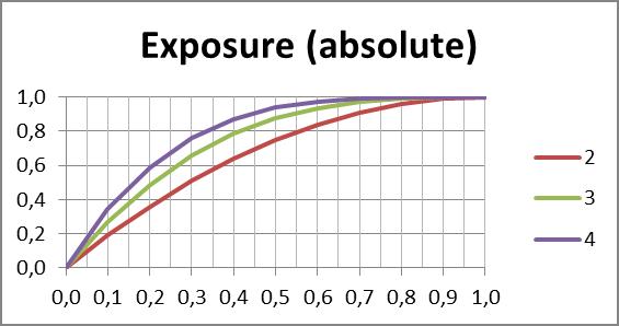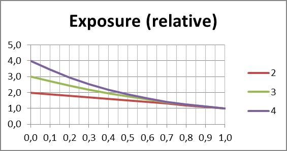 One way expresses Exposure as the lengthening (or shortening) of exposure time. The value 2 means: twice as long, two times as much light into the camera. The opposite of 2 is: one half (0.5). The neutral – do-nothing – value is: 1. This is the way exposure is used in Poser.