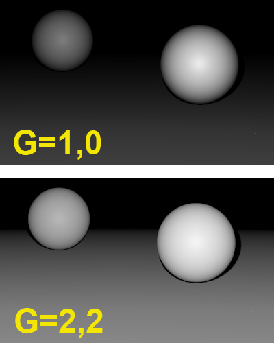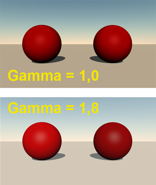 The result of Gamma Correction in Vue is interesting: The ball on the left is painted medium red (RGB=127/0/0) with a Vue internal color swatch. The ball on the right is painted medium red also, but by a texture. You can see that both respond different to the gamma settings. When Gamma Correction is switched on (I’m running Vue Complete so I don’t have the advanced control offered in the Pro software), the sky, the ground and the left ball go brighter. They all are driven by internal color swatches. Shadows and highlights brighten up as well. The ball on the right however hardly changes color. It might look as if it darkens since everything else brightens up, but Photoshop measurements reveal that a spot in the middle, somewhat away from the (brightened) highlight, remains as 50% brightness in both images. It also reveals a small drop in saturation which might be due to gamma correction applied to the atmospherics as well.