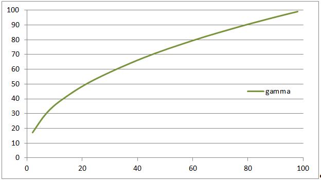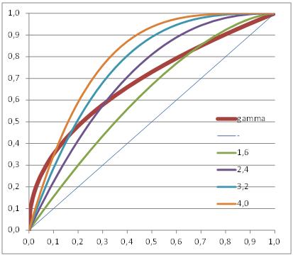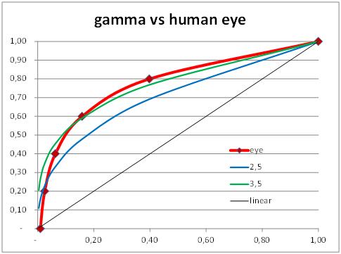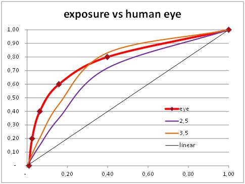This is why gamma correction is more pleasing than exposure correction. See the gamma=3,5 curve (left graph, green line) which offers a minor overshoot in the darks as well as a minor undershoot in the brights. This is what we appreciate. We feel more comfortable with it.