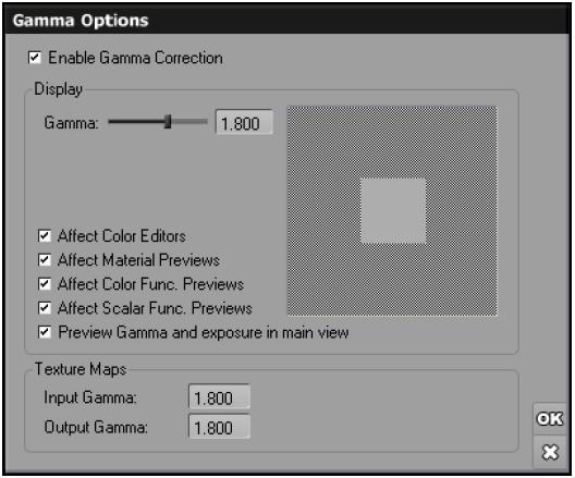 Vue offers Gamma Correction as well. In the Artists products (Esprit, Studio and Compete) it cannot be adjusted, the 1,80 value is the only option and you can either use it, or switch it off. Also, input gamma (anti-correcting the textures) and output gamma (correcting the rendered result) are the same – see image at the right.