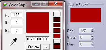 See Color Cop measuring the display while Vue sets the color: To bring those back in sync, all color swatches have to be adjusted manually. When Gamma Correction is switched on, an internal 50% red (127/0/0) translates to 173/0/0 on screen (and in the rendered result). The other way around, an internal 73/0/0 translates to 127/0/0 on screen, and in the render, and in sync with a 50% red texture map.