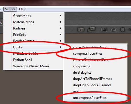 | Poser can always read them, but when exchanging files to other programs it’s worth testing first. As the files are simply zipped, I can read them as well by using any unzipper, like WinZip or 7Zip or alike. Poser can also help me compressing and uncompressing files, via the Scripts \ Utility \ … menu options. | |