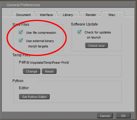 Next to the scene files, Poser can save large portions of raw data, like morph targets, in separate files in binary form: the second checkbox in the Misc tab. The advantage of this is that it keeps the scene file relatively small while the binary file does not require further compression, and saves and loads as fast as possible. This results in .pmd files (Poser Morph Data).