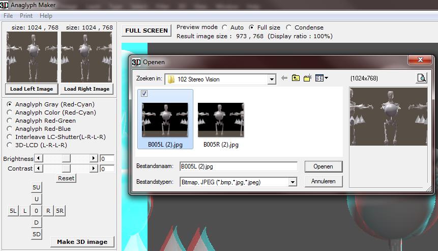 For still images, this can be done in a special program like the Anaglyph Maker, available as a freebee on the internet http://www.stereoeye.jp/index_e.html. It’s a Windows program. I unpack the zip and launch the program, there is nothing to install. Then I load the left and right images
