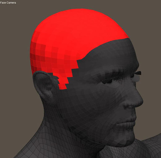 As a first step, I start to full all polys in the Photoshop image with a color, until I have a neat match to the Hair Growth Group on Ryans head. And I whiten out all the elements in the template that I won’t need anyway, but I do not alter the size of the image itself.