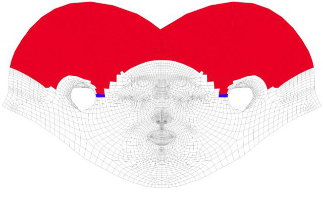 There are special programs that can help me, which also help mapping tattoos, texts and logos (decals), or just paint in 3D straight on the head itself. There are various Photoshop tools and techniques to help me out (Liquify etc), and I can deploy some Photo Morphing program – which turn a lady into a man or a jaguar, but of course also can map a subdivided rectangle onto a curves template.