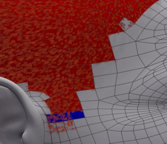 Next, I’ve got to answer the question; did I really pick the right portions in the image? The template can be done in a lower resolution than the 3D mesh, so one row of blocks in the 2D image might represent multiple rows of polys in 3D. And I’m a bit worried about the ear-region. So I save the template to a new name, and in the Poser Material Room I swap Ryans neat texture for the saved template. Don’t overwrite anything, and ensure that you know where to find the original texture, to get back where you came from originally. I made a copy of that in my project folder when I found out about the colors, describe above. From the result I find that I did quite well, except that at Ryans right (my left) the head-hair (red) meets the beard (blue marker) two rows lower than at Ryans left. To be corrected in the Growth Group. At both left and right, there is something at the ends of the front hairline, and you can see at the top-right in the image. A white square does contain hair. To be corrected in Photoshop. The area around the ear can be improved up, to be corrected in both.Smoothing Up