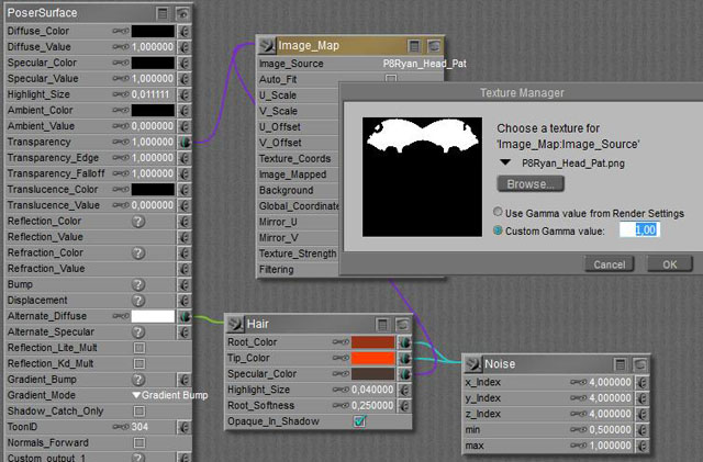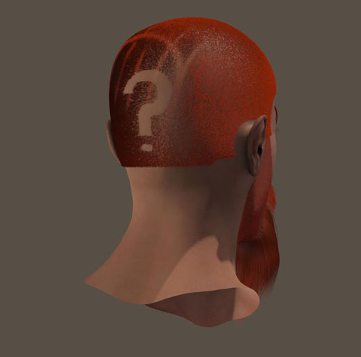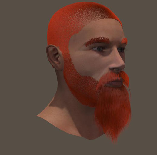 Right click in the area gives me New Node, I pick Image_Map from the 2D textures menu, I pick my saved image as the Image Source in the node – and for those working in PoserPro: I set Custom Gamma value to 1,0 (although it does not matter much, as the image contains black and white only). Now I connect the image map node to Transparency, and I set its value to 1.0. So everywhere the image shows black I get full transparency. That is, when I suppress all edge effects that Poser offers to make neat glasses and bottles. So, Transparance_Edge and Falloff are set to 1.0 as well, otherwise I get some left overs in the shaved are (try for yourself. It’s no too bad for the pattern put it’s awful for the removed jags). This is not enough, because absent hair should not reflect light as well. So I also connect the image map to the Specular Color entry in the Hair node. Now the hair has no specularity any more in those places where the image is black. Now we’ve done this, it’s only a small extra step to the other parts. Growing hair, making, checking and adjusting the template, satisfying those who want a shaving pattern in the beard, playing the colors, etcetera. Note that in the template I did not make a Left/Right difference for brows or mustache. When there is no hair, a white area in the image won’t create it. Only when there is hair, the black area in the image can hide it. The main differences between the various areas, on face as well as chest (same principle to get the jags out), are the settings for hair length, and styling.