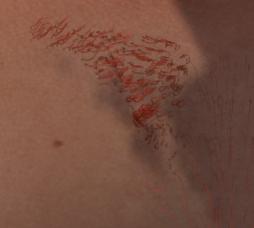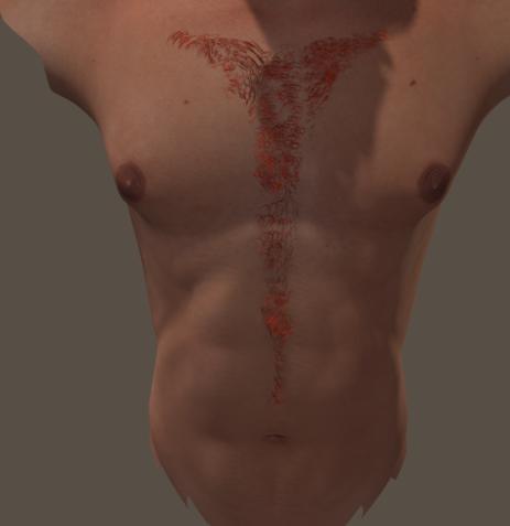 For the body hair, I assigned hair groups to Left and Right Collar, Chest, Abdomen and a piece of the Waist. The two latter parts got shorter hairs, 3 resp 2 cm instead of the 4 cm for the other parts. Then I used the Body template for Ryan to create a neat smooth mask, just to get rid of the jagged edges of the hair group polys. If one wants to shave figures in there: be my guest J. I used thick hair (2mm root, 0.8mm tip) and I found out that I got a neat coverage when I distributed about 300,000 hairs over the total body area (3 large areas of 85,000 plus the rest).