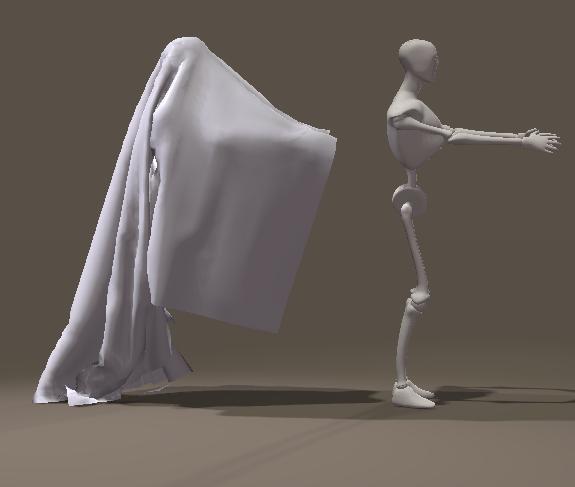 But the sim result is more absolute than that, it’s absolute in time as well. You will find out when you set the sim properties, and not only the End Frame but the First Frame as well. Say, I put 31 to 60 in there. Then the cloth sim will make a 30 frame result, considering all object positions… from frame 1 to 30, and then publishes the result into frames 31 to 60. So for my girl wearing a robe, all movements of the robe will follow her moves… with a second (30 frames) difference. Girl chased by her wardrobe, with this we can have fun. I’m not sure about its practical use yet.