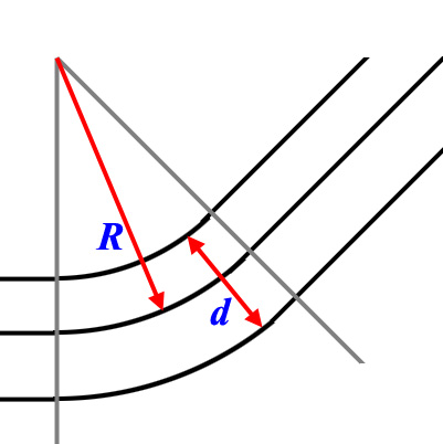 As can be seen in the figure, the core of the fiber makes a turn forcing the outer part to relatively stretch d/2R and the inner part to shrink d/2R as well.